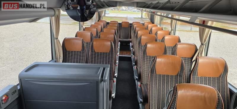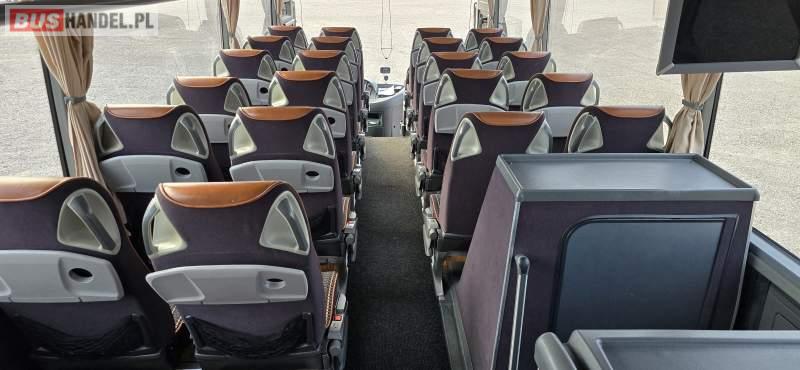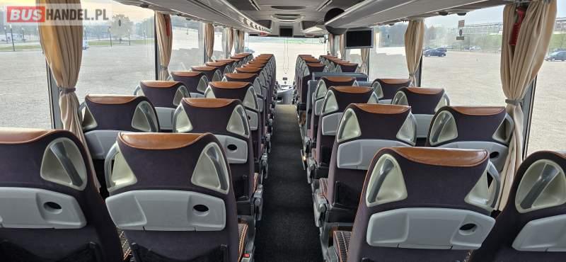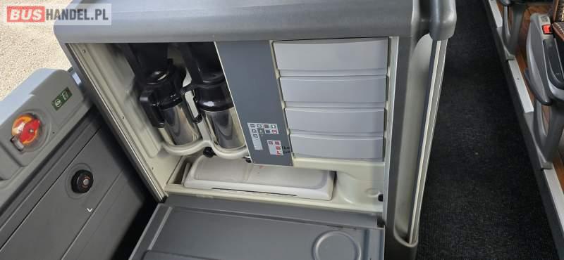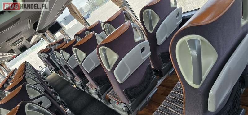 : video, WC, lodówka, caffebar, kabina sypialna, oświetlenie indywidualne, nawiewy dyszowe, siateczki, ABS, ASR, tempomat, retarder, telefon, CD, podnóżki, stoliczki, mikrofon, klimatyzacja, radio, wyświetlacz matrix, sejf, regulacja wysokości nadwozia, centralny zamek, podwójne szyby boczne, wspomaganie kierownicy, elektryczne lusterka, fotele odchylane i rozsuwane, DVD, ogrzewanie stacjonarne, ESP