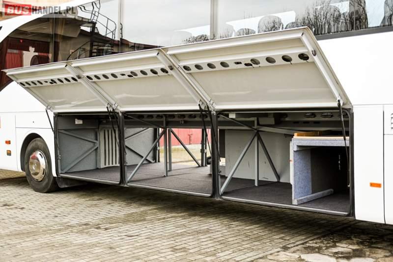 : klimatyzacja, WC, lodówka, caffebar, kabina sypialna, oświetlenie indywidualne, nawiewy dyszowe, podnóżki, stoliczki, siateczki, ABS, ASR, tempomat, retarder, telefon, nawigacja, CD, mikrofon, radio, fotele odchylane i rozsuwane, kuchenka mikrofalowa, wyświetlacz matrix, sejf, regulacja wysokości nadwozia, centralny zamek, podwójne szyby boczne, wspomaganie kierownicy, elektryczne lusterka, ogrzewanie stacjonarne, DVD, hak holowniczy, ESP