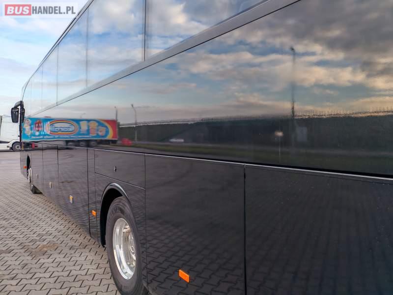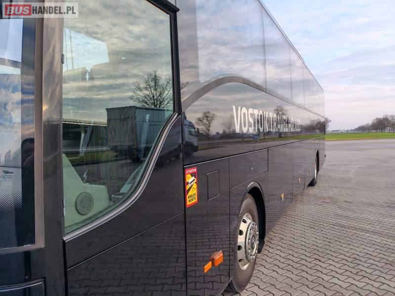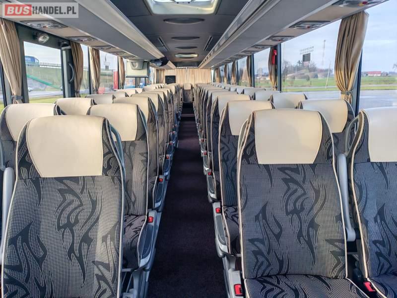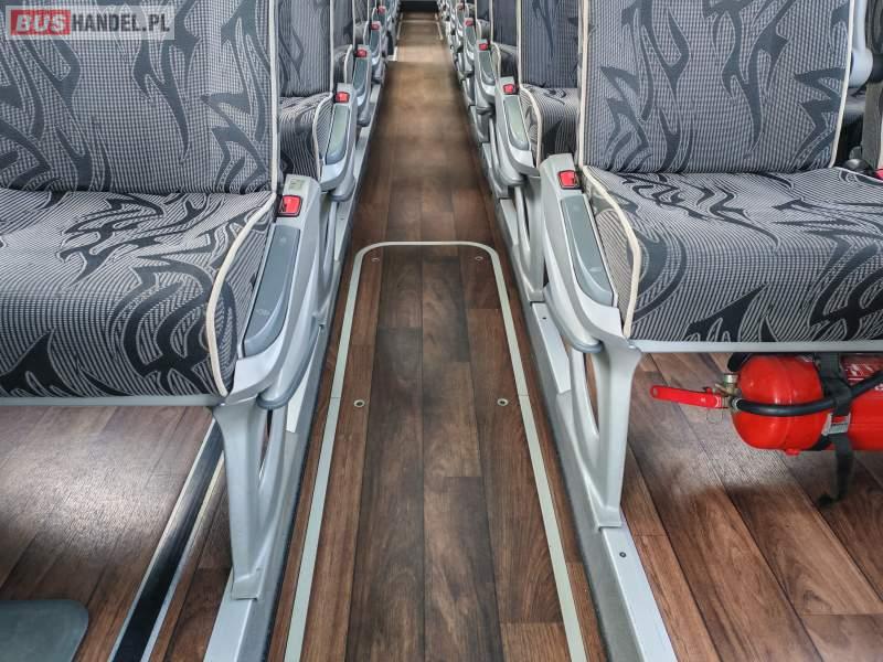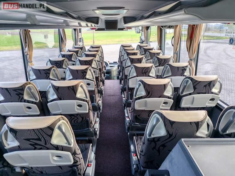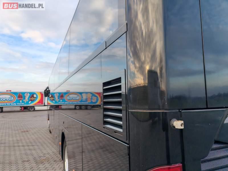 : klimatyzacja, video, WC, lodówka, caffebar, oświetlenie indywidualne, nawiewy dyszowe, podnóżki, stoliczki, siateczki, ABS, tempomat, retarder, telefon, nawigacja, CD, mikrofon, radio, fotele odchylane i rozsuwane, rampa dla inwalidów, sejf, regulacja wysokości nadwozia, centralny zamek, podwójne szyby boczne, wspomaganie kierownicy, aluminiowe felgi, elektryczne lusterka, ogrzewanie stacjonarne, DVD, ESP