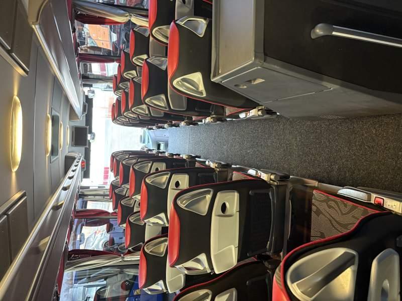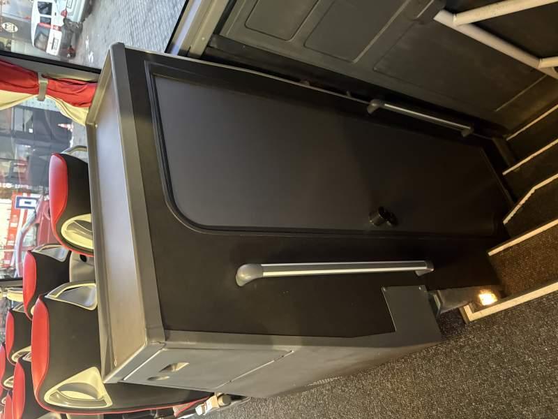 : video, lodówka, kabina sypialna, fotele odchylane, siateczki, tempomat, retarder, telefon, stoliczki, mikrofon, klimatyzacja, radio, sejf, podwójne szyby boczne, wspomaganie kierownicy, hak holowniczy
