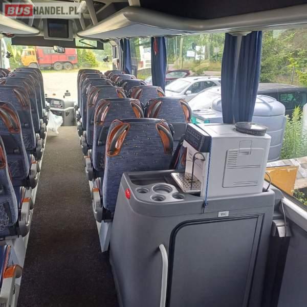 : video, WC, lodówka, caffebar, kabina sypialna, oświetlenie indywidualne, nawiewy dyszowe, siateczki, ABS, ASR, tempomat, retarder, nawigacja, CD, podnóżki, stoliczki, mikrofon, klimatyzacja, radio, sejf, regulacja wysokości nadwozia, centralny zamek, podwójne szyby boczne, wspomaganie kierownicy, elektryczne lusterka, aluminiowe felgi, fotele odchylane i rozsuwane, DVD, ogrzewanie stacjonarne, hak holowniczy, ESP