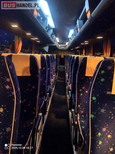 : klimatyzacja, video, WC, lodówka, caffebar, kabina sypialna, nawiewy dyszowe, fotele odchylane, podnóżki, stoliczki, siateczki, ABS, ASR, retarder, CD, mikrofon, radio, regulacja wysokości nadwozia, centralny zamek, podwójne szyby boczne, wspomaganie kierownicy, elektryczne lusterka, ogrzewanie stacjonarne, DVD, hak holowniczy