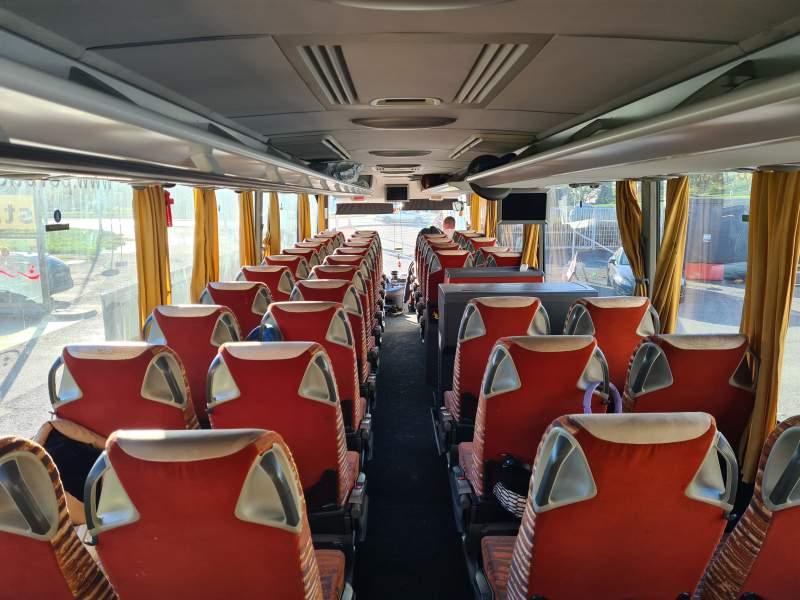 : WC, lodówka, caffebar, kabina sypialna, oświetlenie indywidualne, siateczki, ABS, ASR, tempomat, retarder, CD, podnóżki, stoliczki, mikrofon, klimatyzacja, radio, regulacja wysokości nadwozia, centralny zamek, podwójne szyby boczne, elektryczne lusterka, fotele odchylane i rozsuwane