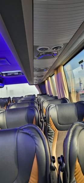 : fotele odchylane, oświetlenie indywidualne, siateczki, ABS, ASR, tempomat, retarder, podnóżki, stoliczki, mikrofon, klimatyzacja, radio, regulacja wysokości nadwozia, podwójne szyby boczne, wspomaganie kierownicy, elektryczne lusterka, fotele odchylane i rozsuwane, DVD, ogrzewanie stacjonarne, hak holowniczy, ESP