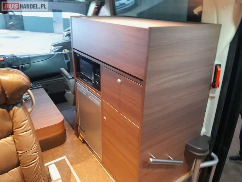 : video, lodówka, caffebar, fotele odchylane, oświetlenie indywidualne, nawiewy dyszowe, ABS, ASR, tempomat, retarder, nawigacja, CD, podnóżki, stoliczki, mikrofon, klimatyzacja, radio, kuchenka mikrofalowa, regulacja wysokości nadwozia, centralny zamek, wspomaganie kierownicy, elektryczne lusterka, fotele odchylane i rozsuwane, DVD, ogrzewanie stacjonarne, ESP