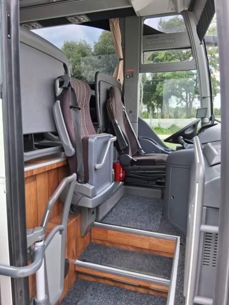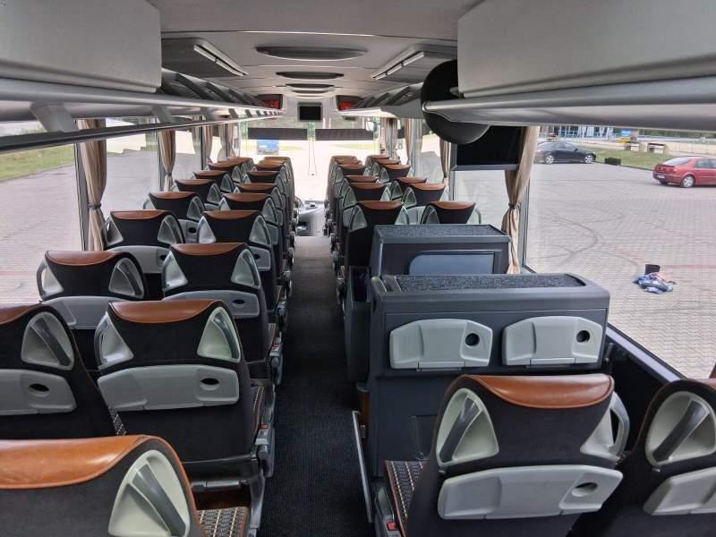 : video, WC, lodówka, kabina sypialna, fotele odchylane, oświetlenie indywidualne, nawiewy dyszowe, siateczki, ABS, ASR, tempomat, retarder, CD, podnóżki, stoliczki, mikrofon, klimatyzacja, radio, regulacja wysokości nadwozia, centralny zamek, podwójne szyby boczne, wspomaganie kierownicy, elektryczne lusterka, aluminiowe felgi, DVD, ogrzewanie stacjonarne, ESP