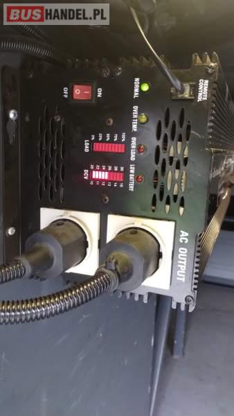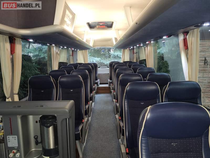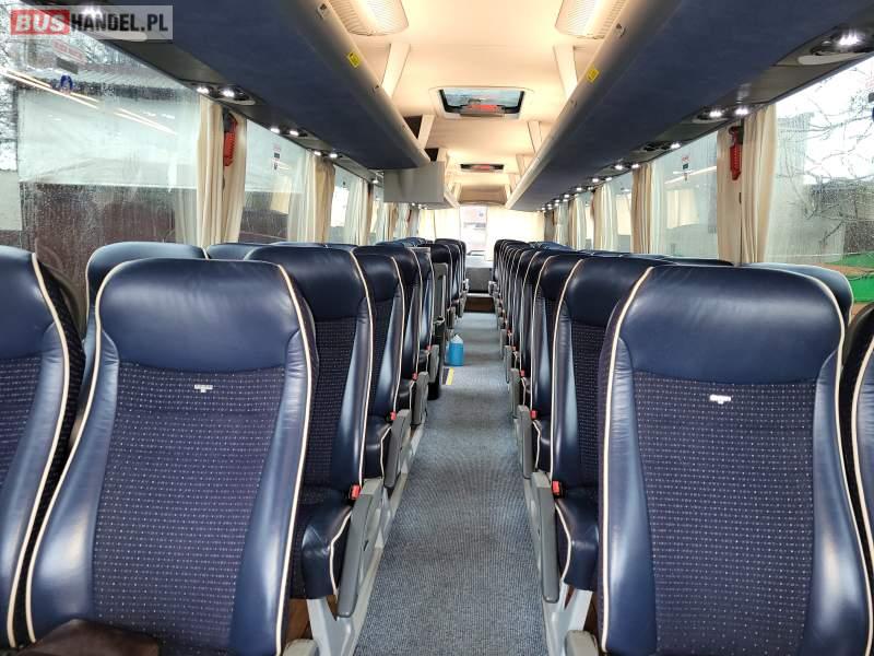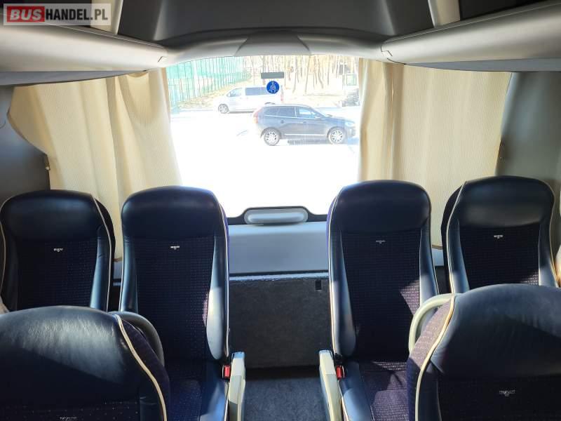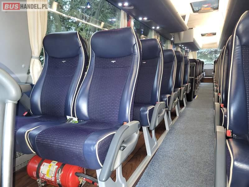 : video, WC, lodówka, caffebar, kabina sypialna, oświetlenie indywidualne, nawiewy dyszowe, siateczki, ABS, ASR, tempomat, retarder, telefon, nawigacja, CD, podnóżki, stoliczki, mikrofon, klimatyzacja, radio, sejf, regulacja wysokości nadwozia, centralny zamek, podwójne szyby boczne, wspomaganie kierownicy, elektryczne lusterka, fotele odchylane i rozsuwane, DVD, ogrzewanie stacjonarne, ESP