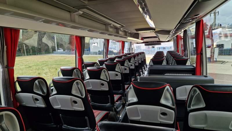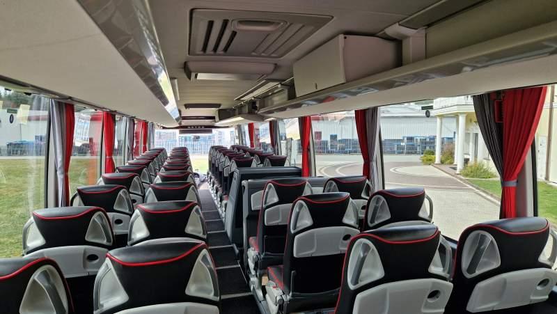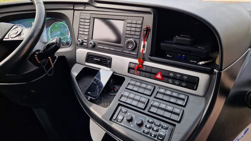 : klimatyzacja, video, WC, lodówka, caffebar, kabina sypialna, oświetlenie indywidualne, nawiewy dyszowe, fotele odchylane, podnóżki, stoliczki, siateczki, ABS, ASR, tempomat, retarder, telefon, nawigacja, CD, mikrofon, radio, fotele odchylane i rozsuwane, regulacja wysokości nadwozia, centralny zamek, podwójne szyby boczne, wspomaganie kierownicy, elektryczne lusterka, ogrzewanie stacjonarne, DVD, hak holowniczy, ESP