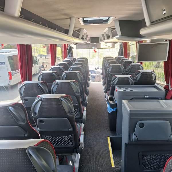 : klimatyzacja, video, WC, lodówka, caffebar, kabina sypialna, oświetlenie indywidualne, nawiewy dyszowe, podnóżki, stoliczki, siateczki, ABS, ASR, tempomat, retarder, nawigacja, CD, mikrofon, radio, fotele odchylane i rozsuwane, sejf, regulacja wysokości nadwozia, centralny zamek, podwójne szyby boczne, wspomaganie kierownicy, elektryczne lusterka, ogrzewanie stacjonarne, DVD, hak holowniczy, ESP