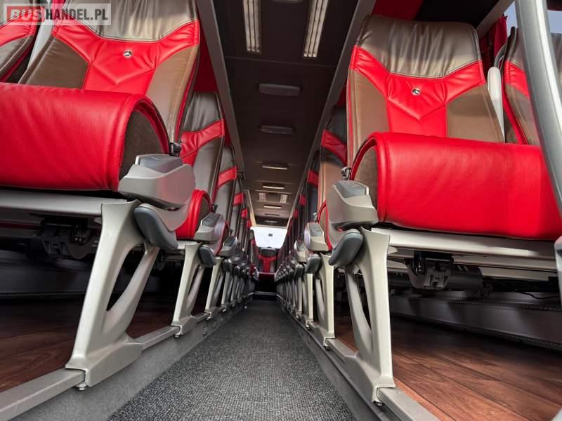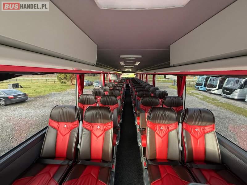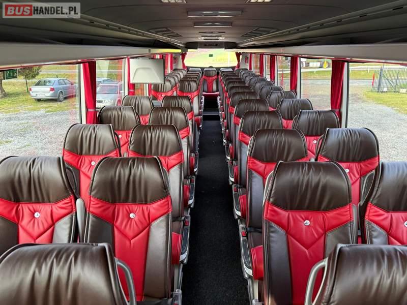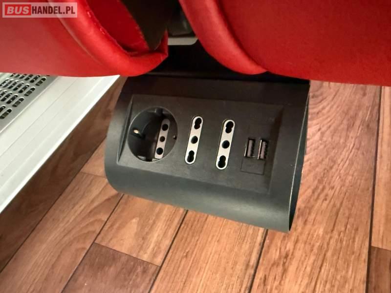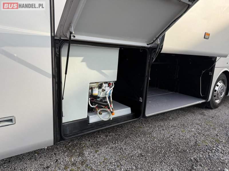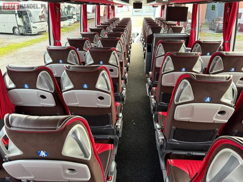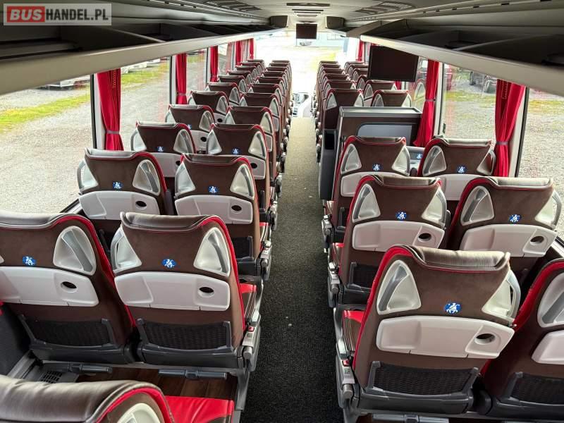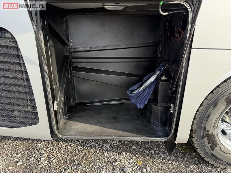 : video, WC, lodówka, kabina sypialna, oświetlenie indywidualne, nawiewy dyszowe, siateczki, ABS, ASR, tempomat, retarder, nawigacja, CD, podnóżki, stoliczki, mikrofon, radio, sejf, regulacja wysokości nadwozia, centralny zamek, podwójne szyby boczne, wspomaganie kierownicy, elektryczne lusterka, aluminiowe felgi, fotele odchylane i rozsuwane, DVD, ogrzewanie stacjonarne, hak holowniczy, ESP