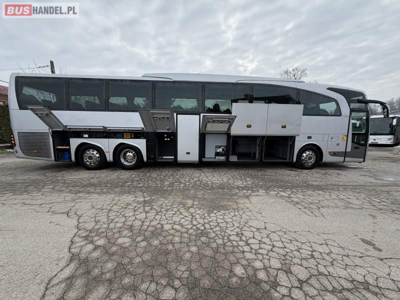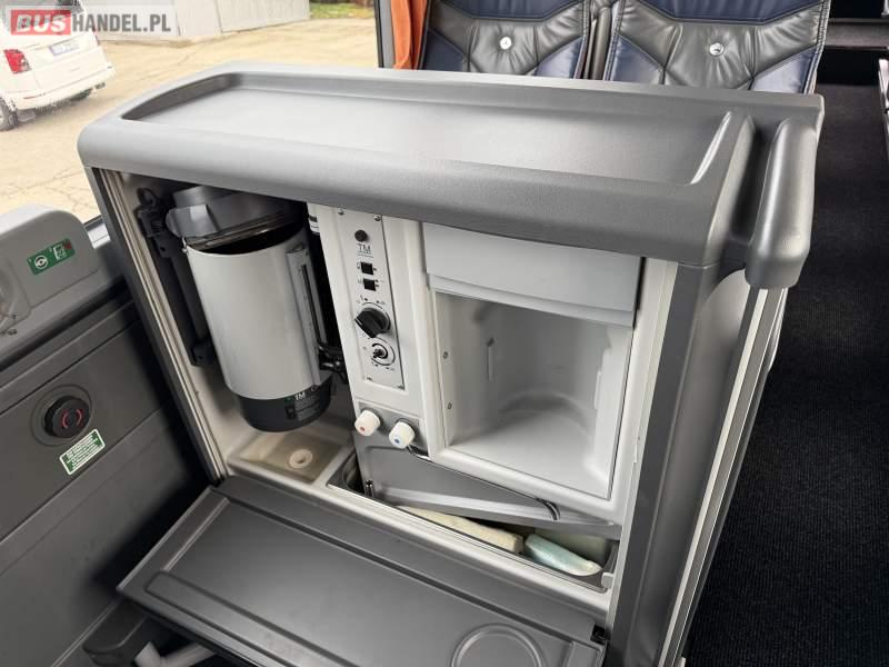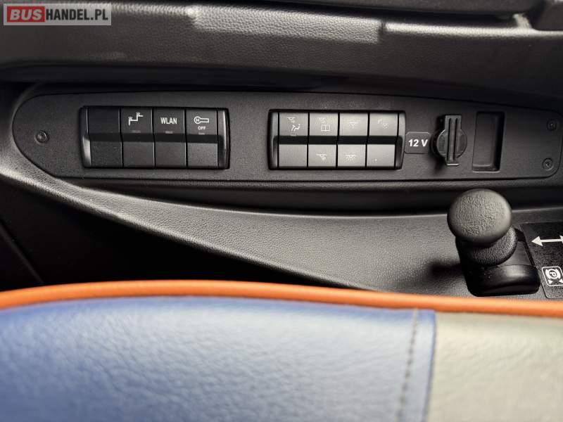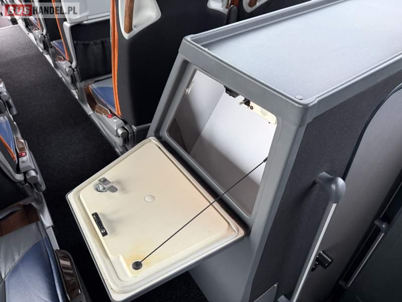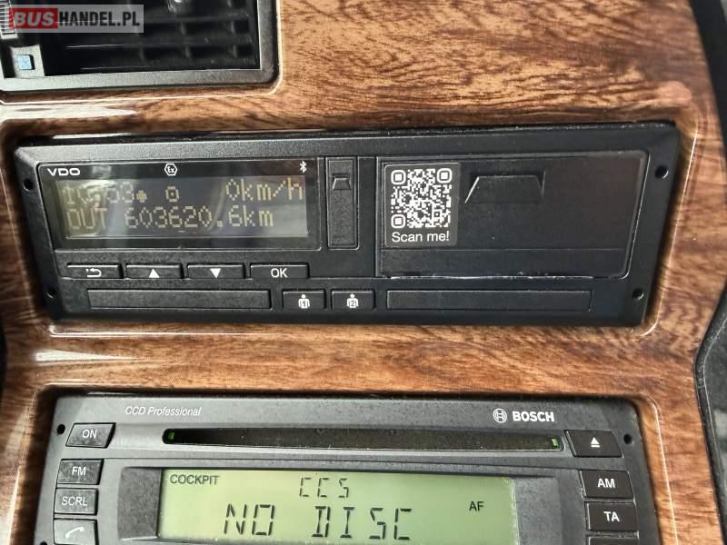 : WC, lodówka, caffebar, kabina sypialna, oświetlenie indywidualne, nawiewy dyszowe, siateczki, ABS, ASR, tempomat, retarder, podnóżki, stoliczki, mikrofon, klimatyzacja, radio, sejf, regulacja wysokości nadwozia, centralny zamek, podwójne szyby boczne, wspomaganie kierownicy, elektryczne lusterka, aluminiowe felgi, fotele odchylane i rozsuwane, DVD, ogrzewanie stacjonarne, ESP