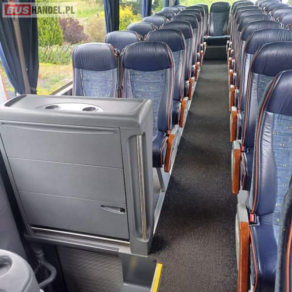 : video, WC, lodówka, caffebar, kabina sypialna, oświetlenie indywidualne, nawiewy dyszowe, siateczki, ABS, ASR, tempomat, retarder, nawigacja, CD, podnóżki, stoliczki, mikrofon, klimatyzacja, radio, sejf, regulacja wysokości nadwozia, centralny zamek, podwójne szyby boczne, wspomaganie kierownicy, elektryczne lusterka, aluminiowe felgi, fotele odchylane i rozsuwane, DVD, ogrzewanie stacjonarne, hak holowniczy, ESP