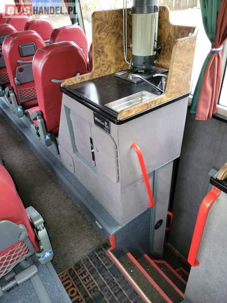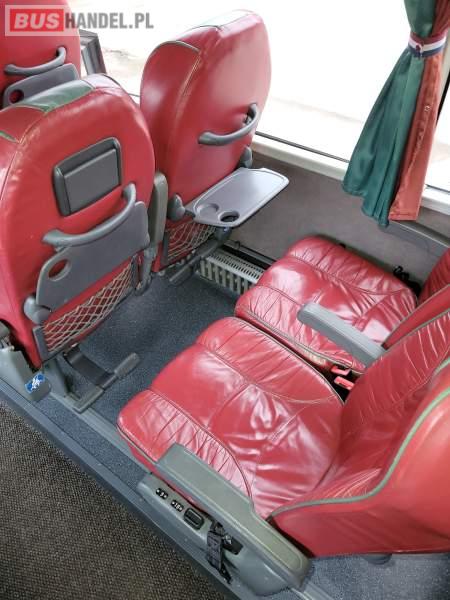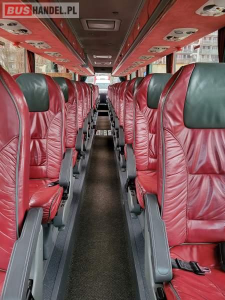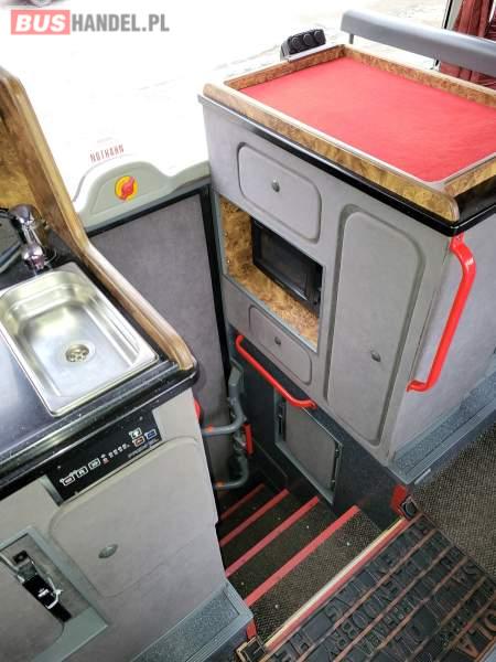 : klimatyzacja, video, WC, lodówka, caffebar, kabina sypialna, oświetlenie indywidualne, nawiewy dyszowe, podnóżki, stoliczki, siateczki, ABS, ASR, tempomat, retarder, nawigacja, CD, mikrofon, radio, fotele odchylane i rozsuwane, kuchenka mikrofalowa, regulacja wysokości nadwozia, centralny zamek, podwójne szyby boczne, wspomaganie kierownicy, aluminiowe felgi, elektryczne lusterka, ogrzewanie stacjonarne, DVD