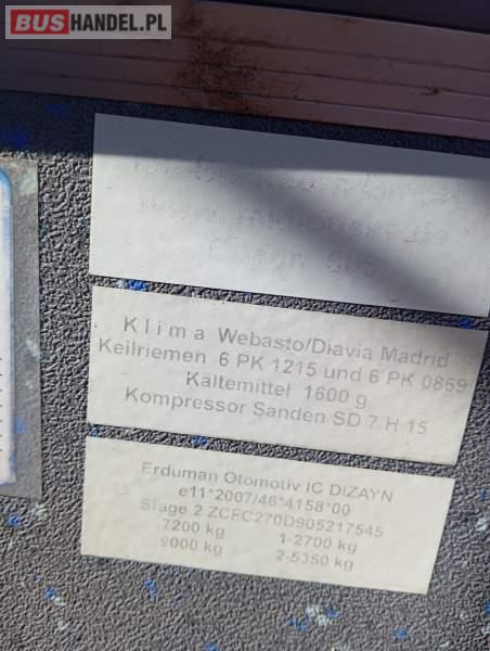 : klimatyzacja, video, lodówka, oświetlenie indywidualne, nawiewy dyszowe, fotele odchylane, podnóżki, stoliczki, siateczki, ABS, ASR, tempomat, retarder, telefon, nawigacja, CD, mikrofon, radio, fotele odchylane i rozsuwane, wyświetlacz matrix, sejf, regulacja wysokości nadwozia, centralny zamek, podwójne szyby boczne, wspomaganie kierownicy, elektryczne lusterka, ogrzewanie stacjonarne, DVD, hak holowniczy, ESP