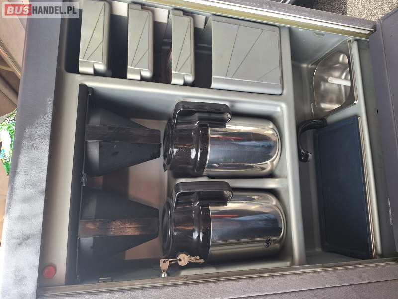 : video, WC, lodówka, caffebar, kabina sypialna, oświetlenie indywidualne, siateczki, ABS, ASR, tempomat, retarder, telefon, CD, podnóżki, stoliczki, mikrofon, klimatyzacja, radio, regulacja wysokości nadwozia, podwójne szyby boczne, wspomaganie kierownicy, elektryczne lusterka, DVD, ogrzewanie stacjonarne