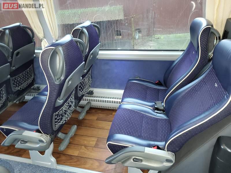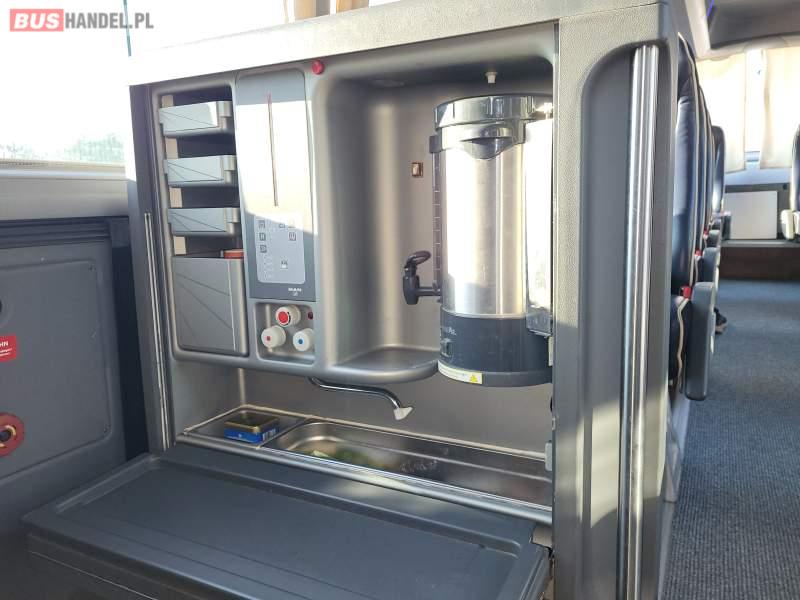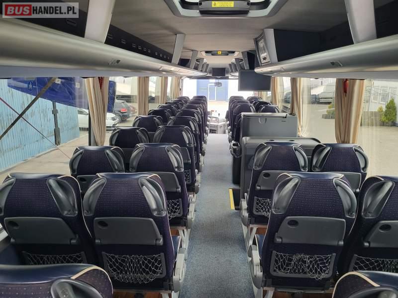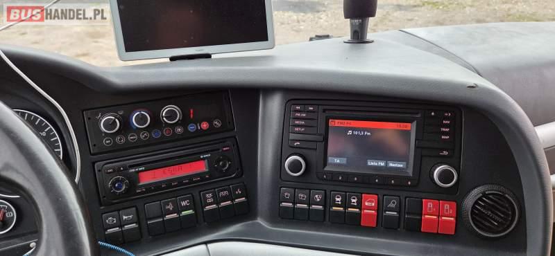 : video, WC, lodówka, caffebar, kabina sypialna, oświetlenie indywidualne, nawiewy dyszowe, siateczki, ABS, ASR, tempomat, retarder, telefon, nawigacja, CD, podnóżki, stoliczki, mikrofon, klimatyzacja, radio, sejf, regulacja wysokości nadwozia, centralny zamek, podwójne szyby boczne, wspomaganie kierownicy, elektryczne lusterka, fotele odchylane i rozsuwane, DVD, ogrzewanie stacjonarne, ESP