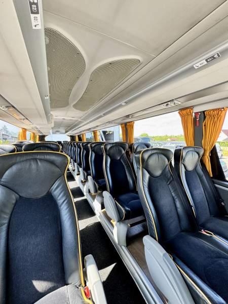 : klimatyzacja, video, WC, lodówka, caffebar, kabina sypialna, oświetlenie indywidualne, nawiewy dyszowe, fotele odchylane, podnóżki, stoliczki, siateczki, ABS, ASR, tempomat, retarder, CD, mikrofon, radio, fotele odchylane i rozsuwane, sejf, regulacja wysokości nadwozia, centralny zamek, podwójne szyby boczne, wspomaganie kierownicy, aluminiowe felgi, elektryczne lusterka, ogrzewanie stacjonarne, DVD, ESP