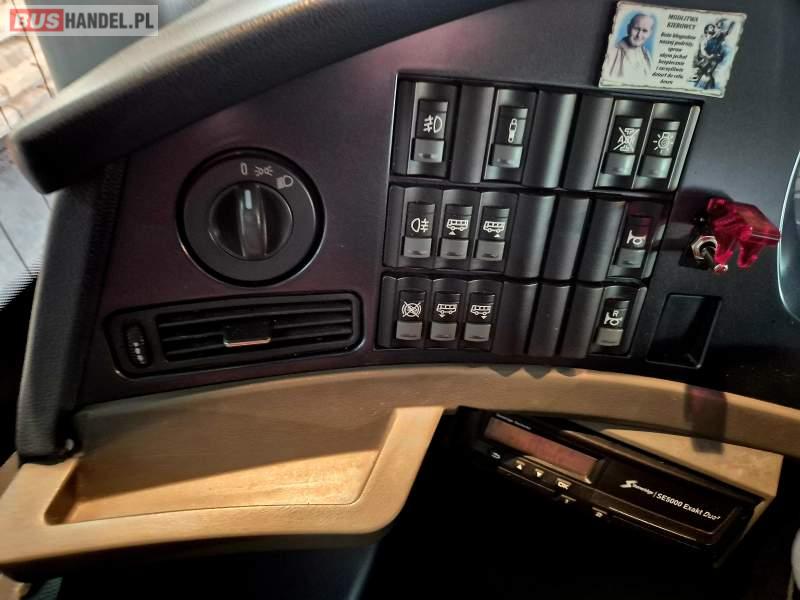 : klimatyzacja, WC, lodówka, caffebar, kabina sypialna, oświetlenie indywidualne, nawiewy dyszowe, fotele odchylane, podnóżki, ABS, ASR, retarder, CD, mikrofon, radio, fotele odchylane i rozsuwane, regulacja wysokości nadwozia, centralny zamek, podwójne szyby boczne, elektryczne lusterka, ogrzewanie stacjonarne, DVD, hak holowniczy, ESP