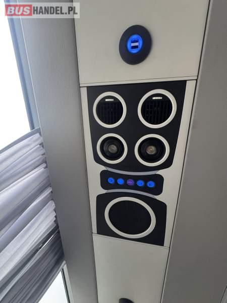 : video, WC, lodówka, oświetlenie indywidualne, nawiewy dyszowe, siateczki, ABS, ASR, tempomat, retarder, CD, podnóżki, mikrofon, klimatyzacja, radio, regulacja wysokości nadwozia, centralny zamek, podwójne szyby boczne, wspomaganie kierownicy, elektryczne lusterka, aluminiowe felgi, fotele odchylane i rozsuwane, DVD, ogrzewanie stacjonarne, ESP