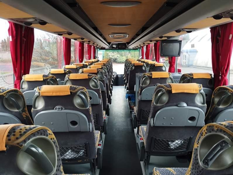 : klimatyzacja, video, WC, lodówka, caffebar, kabina sypialna, oświetlenie indywidualne, nawiewy dyszowe, stoliczki, siateczki, ABS, ASR, tempomat, retarder, CD, mikrofon, radio, fotele odchylane i rozsuwane, podwójne szyby boczne, wspomaganie kierownicy, elektryczne lusterka, ogrzewanie stacjonarne, DVD, ESP