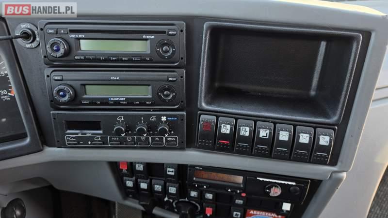 : klimatyzacja, lodówka, oświetlenie indywidualne, nawiewy dyszowe, fotele odchylane, podnóżki, ABS, ASR, tempomat, retarder, CD, radio, regulacja wysokości nadwozia, centralny zamek, podwójne szyby boczne, wspomaganie kierownicy, elektryczne lusterka, ogrzewanie stacjonarne